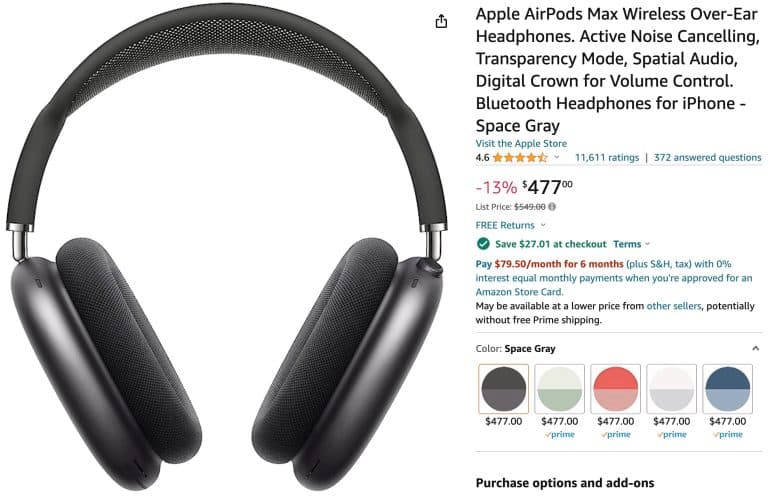 Δείτε το στιγμιότυπο οθόνης παρακάτω για ένα παράδειγμα του τι πρέπει να δείτε όταν αγοράζετε το AirPods Max από την Amazon αυτήν τη στιγμή.