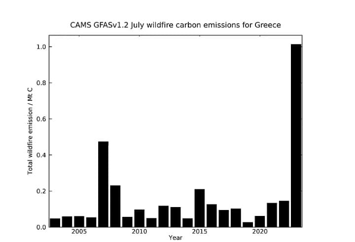 Το Ευρωπαϊκό Σύστημα Πληροφοριών για τις Δασικές Πυρκαγιές (EFFIS) – μια άλλη υπηρεσία του Copernicus – ανέφερε ότι περισσότερα από 173.000 εκτάρια δασών της ΕΕ είχαν γίνει στάχτη στις 22 Ιουλίου. Αυτό είναι υπερδιπλάσιο του μέσου όρου των 80.000 εκταρίων που καταγράφηκε από το 2003 έως το