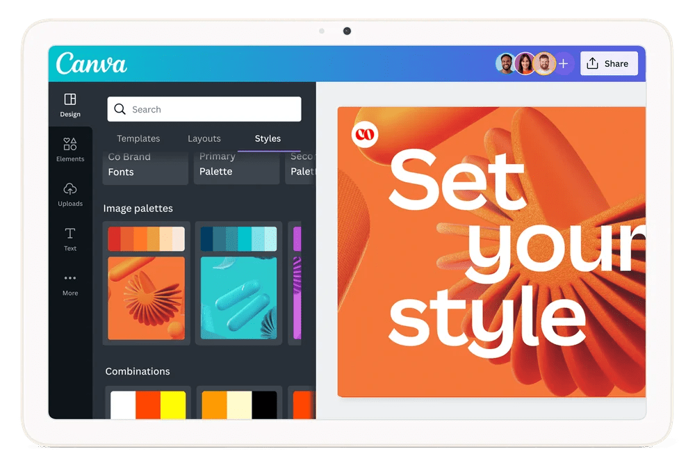 Μια αυστραλιανή διαδικτυακή εφαρμογή γραφικού σχεδιασμού που βοηθά τους χρήστες να δημιουργούν οπτικές παρουσιάσεις, γραφικά μέσων κοινωνικής δικτύωσης, λογότυπα και πολλά άλλα με λειτουργία μεταφοράς και απόθεσης. Είναι εύκολο και γρήγορο να προσθέσετε περιεχόμενο στα συνεχή σχέδιά τους. Εάν οι χρήστες χρησιμοποιούν το Canva σε λειτουργία διαχωρισμού, μπορούν να μεταφέρουν και να αποθέσουν το περιεχόμενό τους από τα μεταφορτωμένα αρχεία και επίσης από άλλες εφαρμογές, για παράδειγμα, τις Φωτογραφίες Google. Διαθέτει μια κάθετη γραμμή πλοήγησης σε tablet Android για να παρέχει περισσότερο χώρο εργασίας επεξεργασίας.