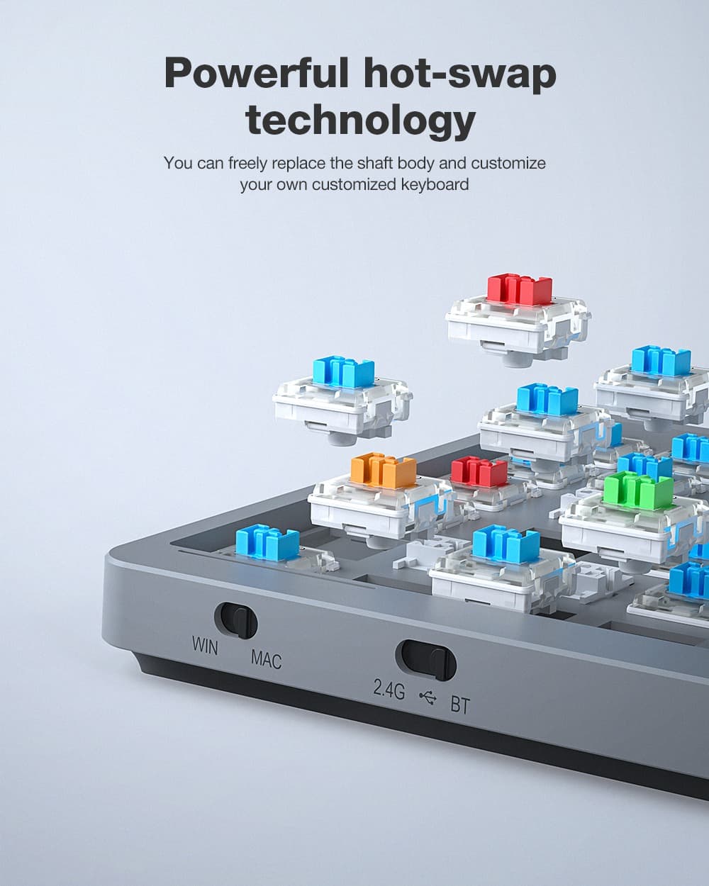 Στο πάνω μέρος του, έχει διακόπτη για επιλογή ανάμεσα σε 2.4G και Bluetooth σύνδεση, ενώ υπάρχει και άλλος ένας διακόπτης για εναλλαγή ανάμεσα σε MAC και PC Mode.