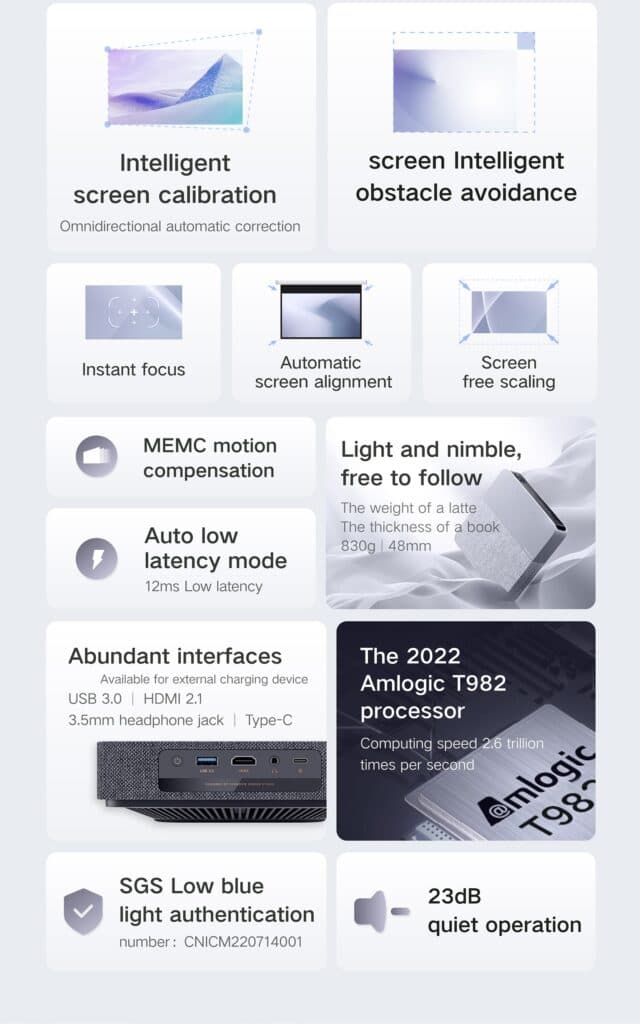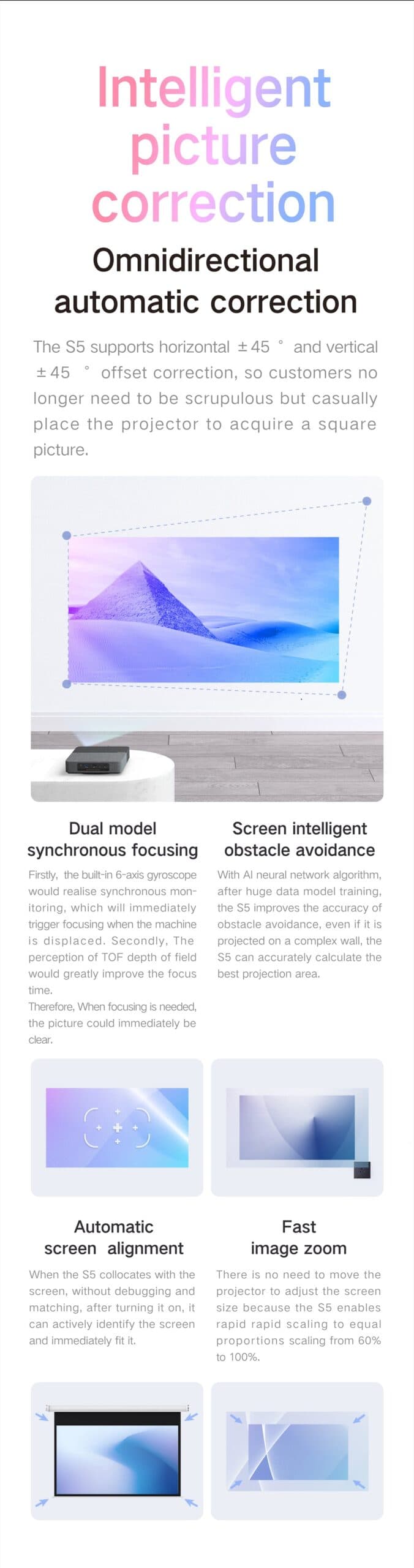 Κι αυτό επειδή το αυτοματοποιημένο σύστημα διόρθωσης εικόνας (omnidirectional keystone correction/non-sensing focus/Automatic Picture avoidance/aytomatic curtain alignment) κάνει όλη τη δουλειά για εσάς!