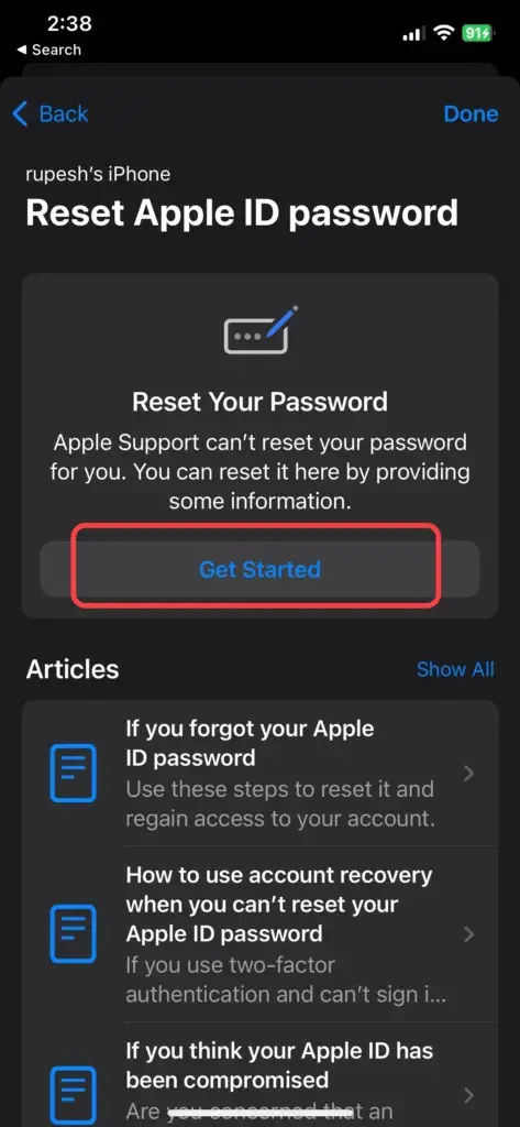 - Επιλέξτε Επαναφορά κωδικού πρόσβασης Apple id και πατήστε Έναρξη.